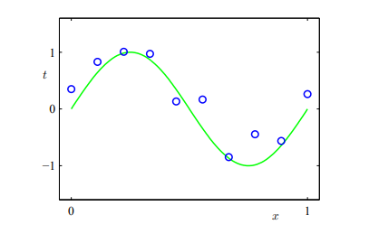 그러면 위와 같은 형태의 점 10개를 얻을 수 있다. 당연하지만 임의로 뽑힌 10개의 값, 그리고 노이즈의 상태에 따라 이 데이터셋은 달라질 것이다. 그리고 이 데이터들만 가지고, 즉 $sin(2\pi x)$에서 왔다는 사실을 잠시 잊고 원래의 함수를 찾는 것이다.